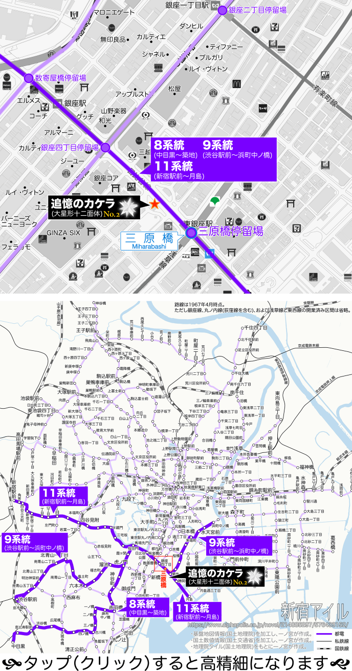 11系統は、四谷と麹町を通り抜けて8系統と合流、築地からは勝鬨橋を経由して月島まで。