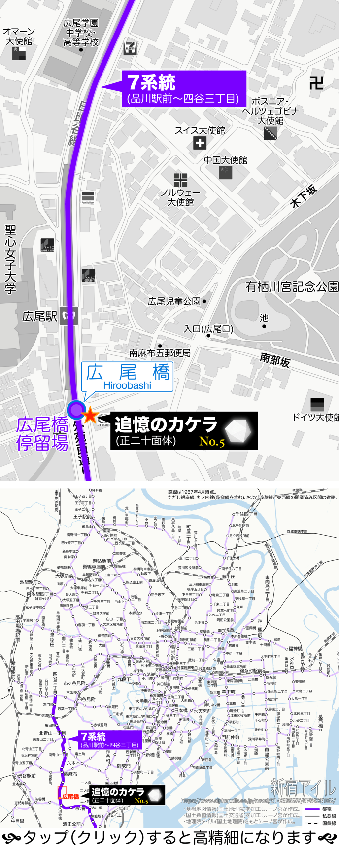 品川駅前から古川に沿って古川橋、四ノ橋、天現寺橋を経由し、青山を通り抜け、四谷三丁目まで結ぶ7系統が南北に通っていた。