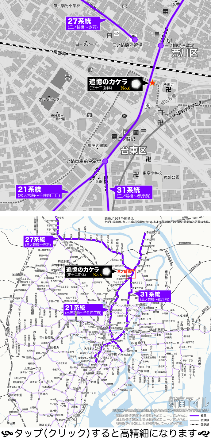 一方、21系統は水天宮前から北上、三ノ輪橋を経由し、千住大橋を渡って千住四丁目まで。