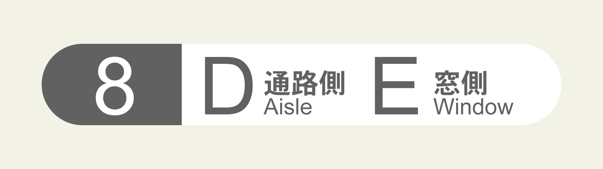 写っているのは「8 D 通路側 E 窓側」と表記された何かのラベルで、「通路側」と「窓側」のそれぞれに、小さく AISLE と WINDOW が併記されていた。