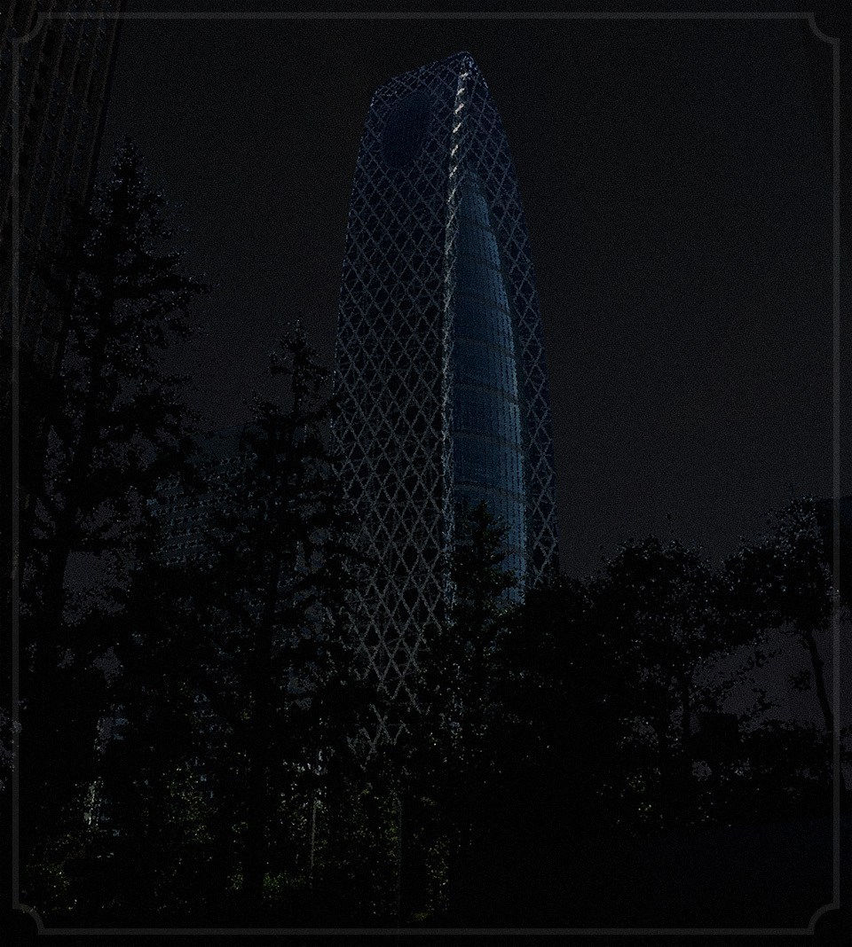 林立する超高層ビル群の中でも、ひときわ目を引くその特異な外観は、コクーンタワーの名のとおりに繭をイメージしているという。