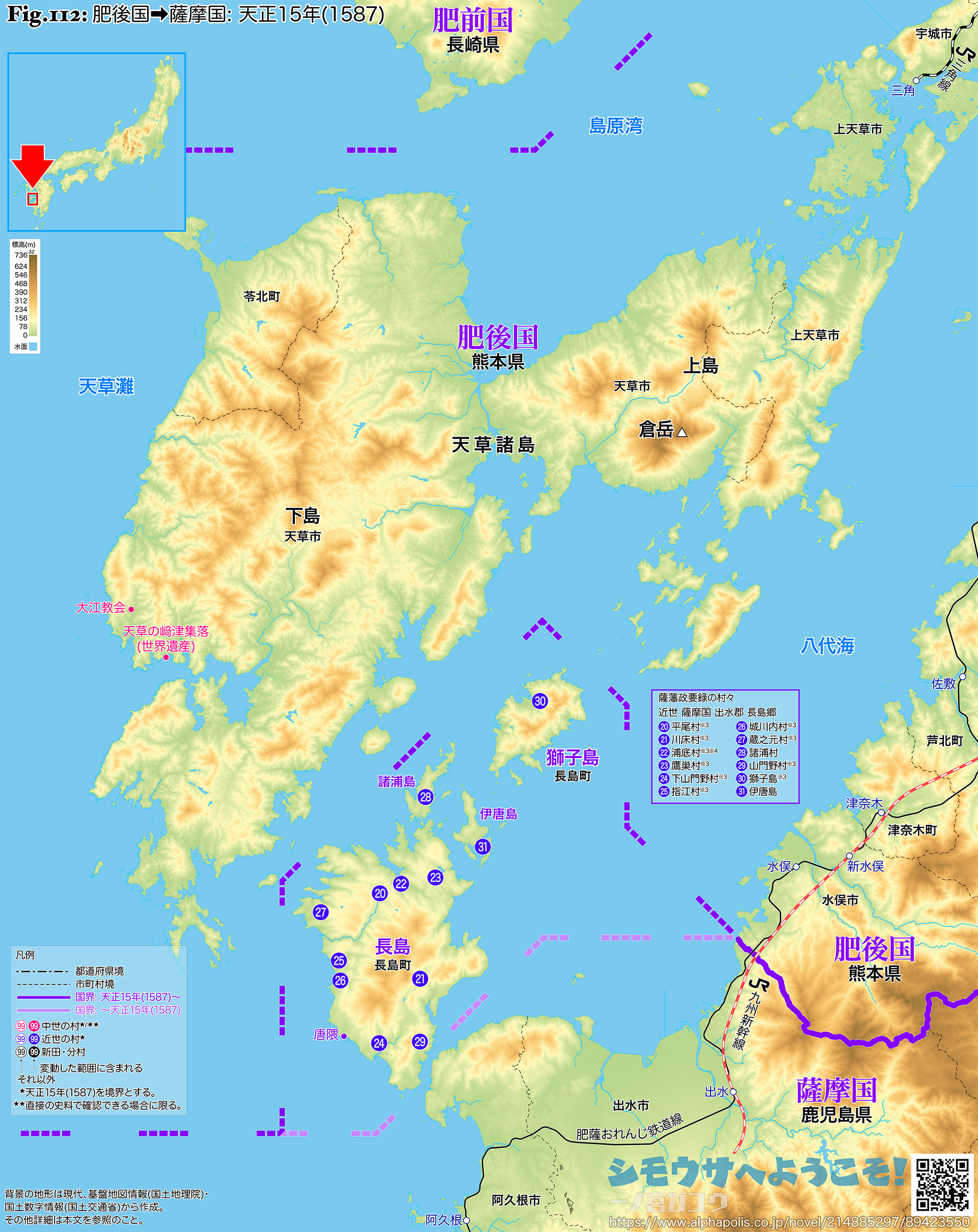 天正15年(1587) 3月、豊臣秀吉は大軍を率いて九州への侵攻を開始した。島津義久 (本家) は弟の義弘らと薩摩・大隅・日向の 3国を領国として統一し、さらに版図を広げていたが、大軍を前に総崩れとなって撤退を余儀なくされ、5月8日までに降服した。これを受け、秀吉は義久に薩摩国、義弘に大隅国 (ただし肝付郡と北郷時久旧領を除く) を安堵した (❉2)。このとき、近世の国界が確定し、長島は薩摩国の一部として把握されるようになったと考えられる。