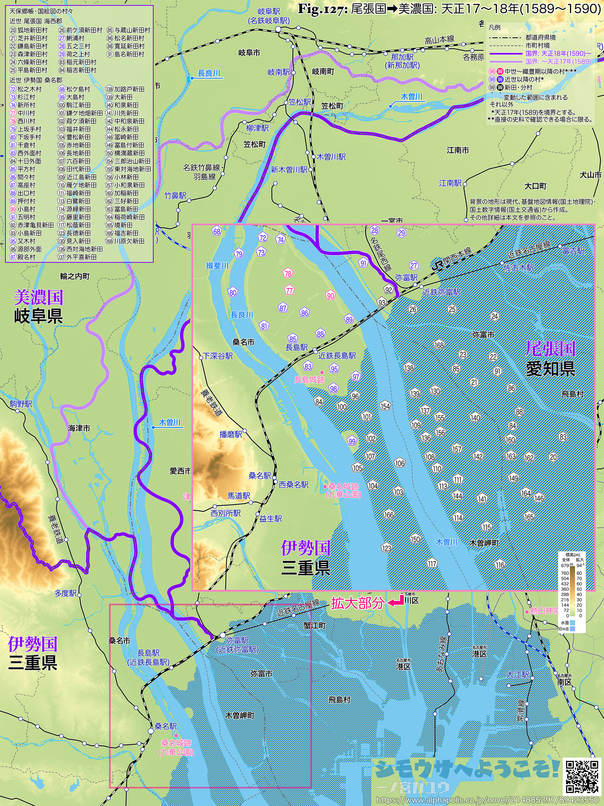 羽栗郡の南西部と中島郡については、小牧・長久手の戦いで信雄から奪い取った部分をそのまま取り上げ、池田輝政の美濃国に組み入れたのだろう。近世以降の木曽川本流のために、一度奪ってしまえば秀吉にとっては守りやすく、信雄は奪い返せなかったと思われ、この意味で近世以降の木曽川本流の流路は、分割の基準にはなっている。