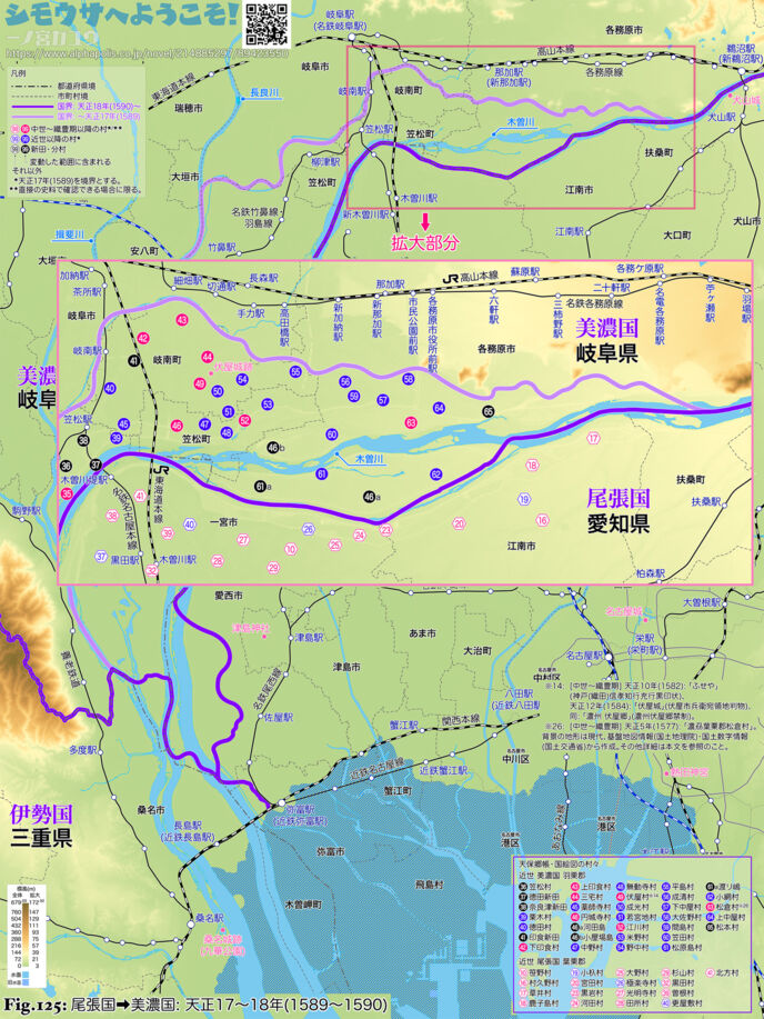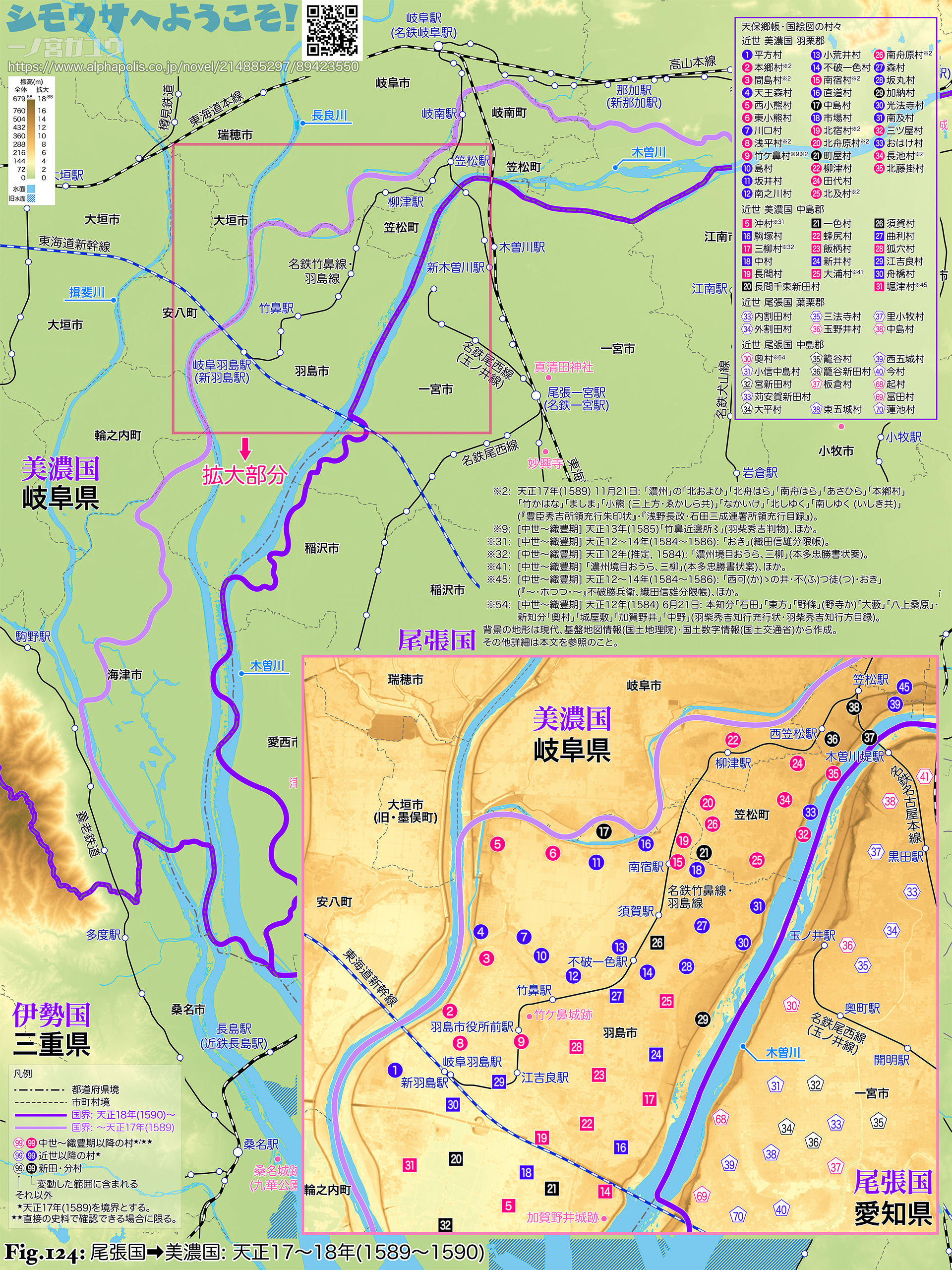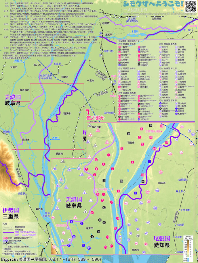 織田信雄分限帳には近世 尾張国 葉栗郡の村々に対応する郷村は含まれていても、近世 美濃国 羽栗郡の村々に対応する郷村は見当たらない。小牧・長久手の戦いでは犬山城 (秀吉) と小牧城 (信雄・家康) で睨み合う持久戦のなか、この一帯は秀吉に奪われてそのまま回復しなかったとみられるが、そもそもそれ以前から曖昧化していたのかもしれない (後述)。