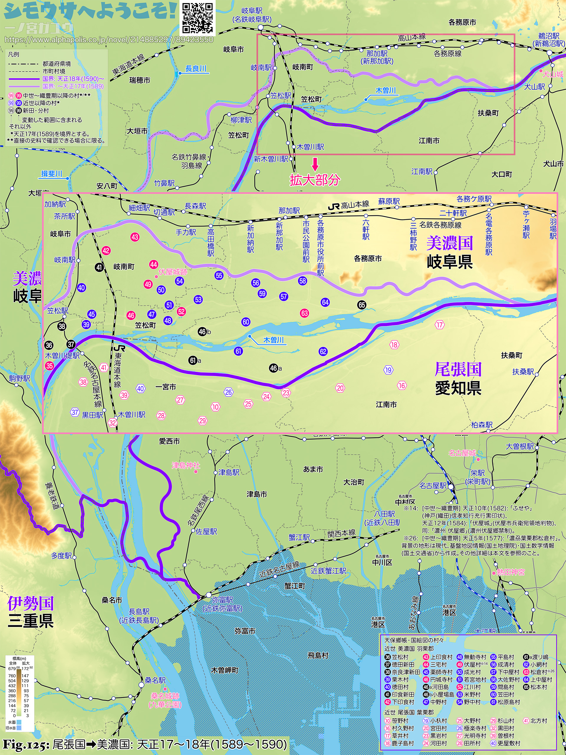 羽栗郡の北東部は木曽川の乱流地帯にあたる。近代に入って河川改修が進行し、現在は 2つの大きな中洲にまとめられて北岸・南岸どちらかにほぼ地続きになっているが、それまではいくつもの中洲が存在し、木曽川は網の目状に分流・合流を繰り返していた。付近の国界はかなり漠然としていたかと思われ、変動というより確定に近いものだったかもしれない。天正5年(1577) 3月15日 の日付のある長光寺梵鐘陰刻銘 (❉20) には「濃刕葉栗郡松倉村」とある一方、慶長14年(1613) 10月12日付の検地帳表紙 (松倉村古記録所収) には「尾州葉栗郡松倉村御縄打水帳」とある。