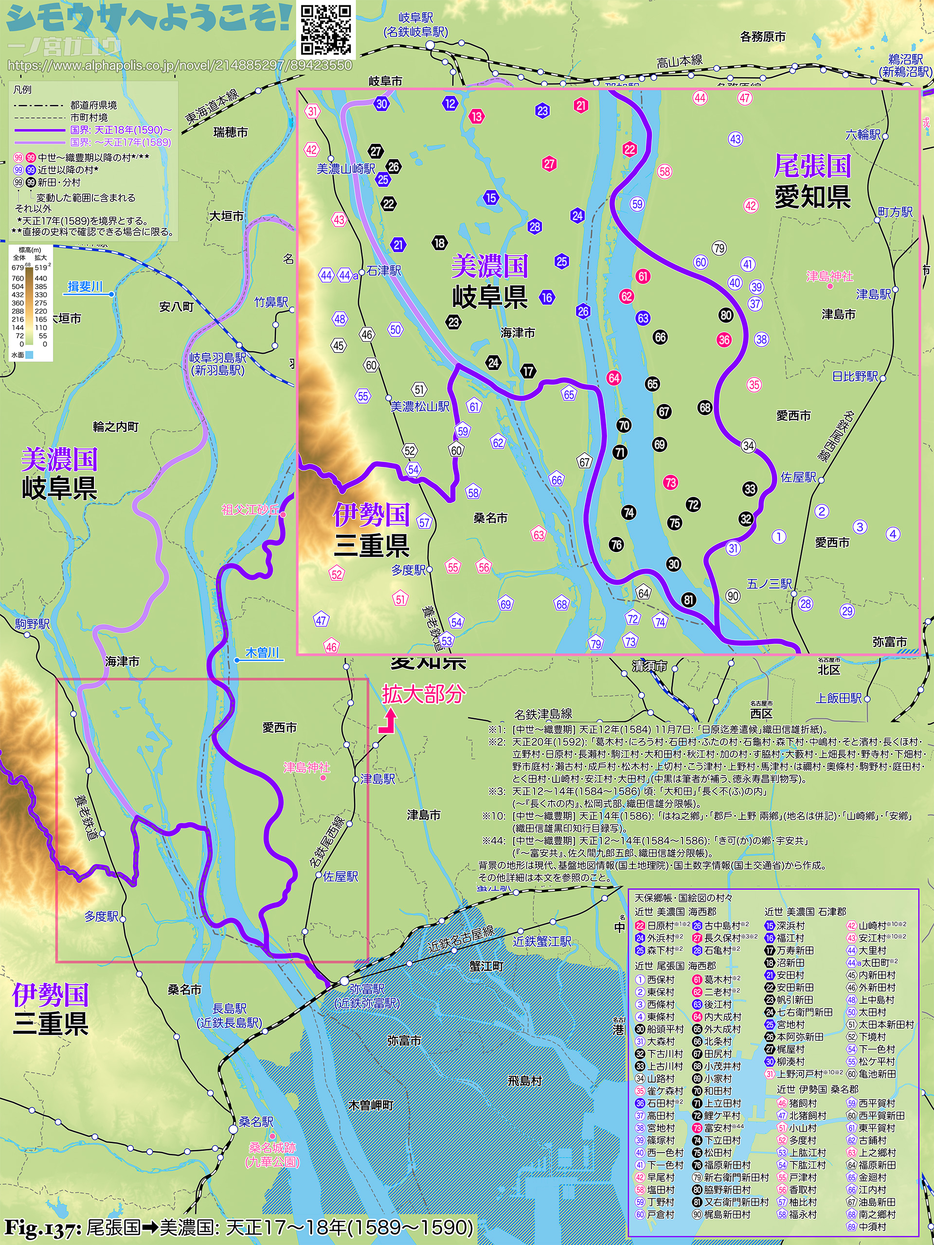 さらに、天正18年(1590) 7月、小田原城の陥落・後北条氏 (小田原北条氏) の滅亡を受け、秀吉は家康に関東 (伊豆・相模・武蔵・上総の全域と下総の大部分、上野の南過半、下野の一部) を与え、その旧領 (三河・遠江・駿河・甲斐、および信濃の南部) を信雄に与えた。しかし信雄は、この時点の領国である尾張と北伊勢に比べれば大幅な加増だったにもかかわらず、旧領にこだわったために秀吉の怒りにふれ、常陸佐竹氏預かりで下野国 那須郡 烏山 2万石とされ、事実上放逐されてしまった。これを受けた尾張国における知行再編成は天正18年(1590) 8月末から 9月にかけて行われた (❉16)。美濃国の総検地は一部は天正18年(1590) 秋にも実施された記録がある (❉14) ので、このとき海西郡も分割され、近世 美濃国 海西郡は成立したと考えられる。