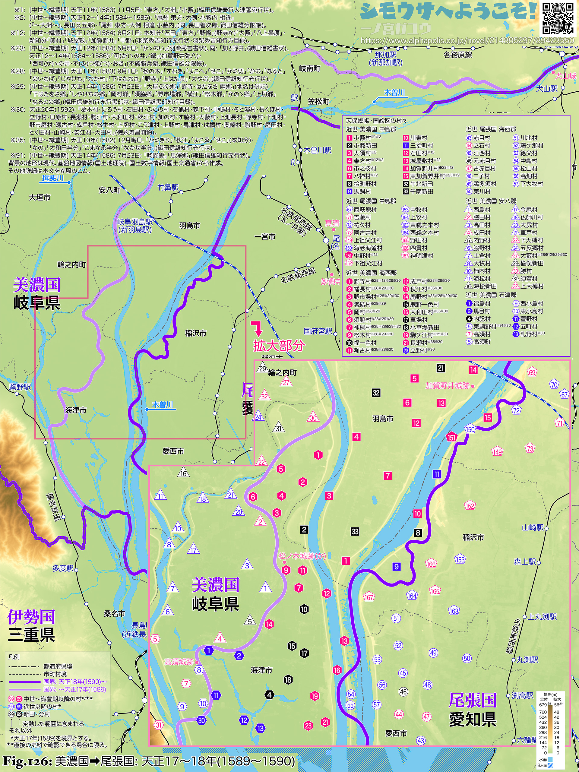 尾張国 葉栗・中島・海西の 3郡は、天正17~18年(1589~1590) 豊臣政権下の検地 (天正の検地) を契機として東西に分割され、北西部は美濃国として把握されるようになった。
