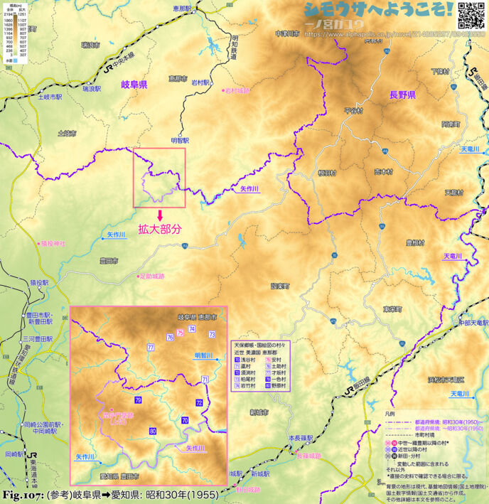 昭和30年(1955) (❉1) 岐阜県 恵那郡 三濃村のうち、近世 美濃国 恵那郡の浅谷・須渕・一色・野原の各村にあたる地域は愛知県 東加茂郡 旭村に編入された。結果として美濃・三河の国界は矢作川から北部の尾根筋へ移動したことになる。もちろん、この時点で美濃国も三河国も地域区分としては用いられておらず、変動があったのは県境だけである。なお残余は岐阜県 明智町に編入された。