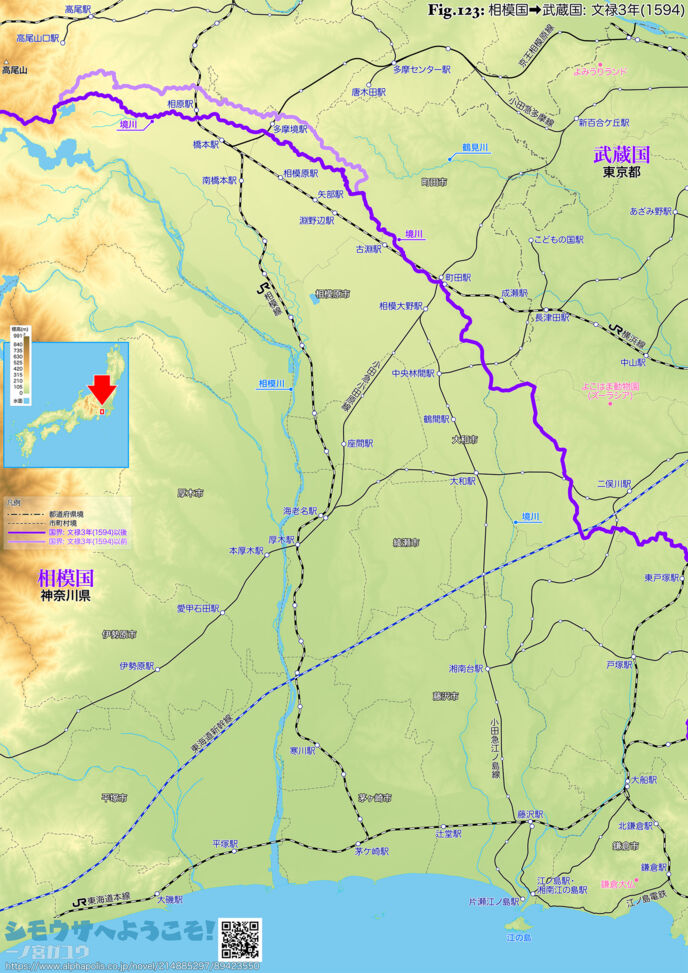 中世 相模国 高座郡 最北部の相原は、文禄3年(1594) 豊臣政権下の検地 (太閤検地) を契機として高座川を境界に分割され、北部は武蔵国として把握されるようになった。