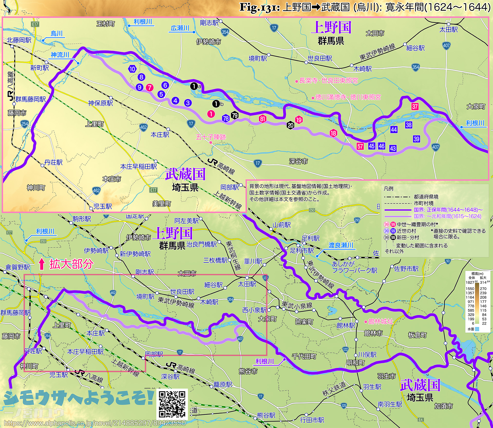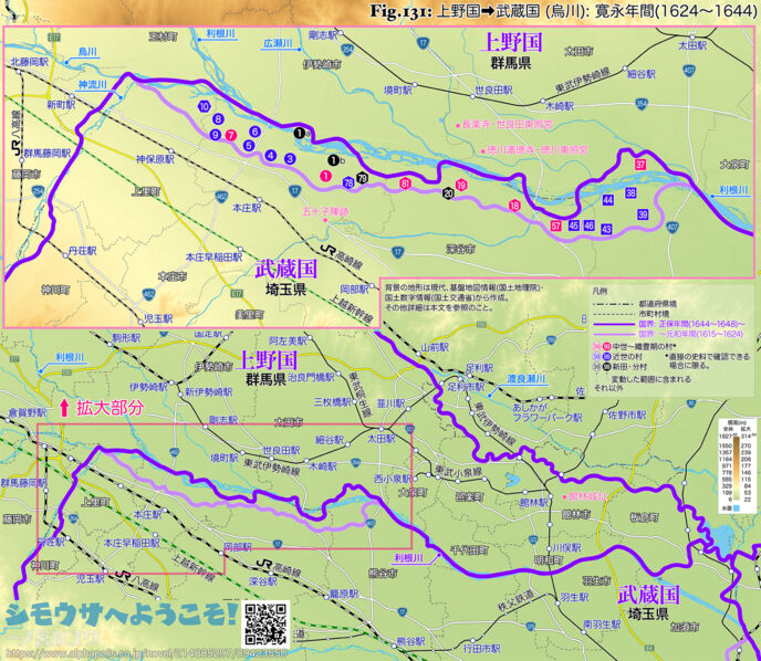 利根川に烏川・広瀬川が合流する付近では、寛永年間(1624~1644) 上野・武蔵の国界が北へ移動した。