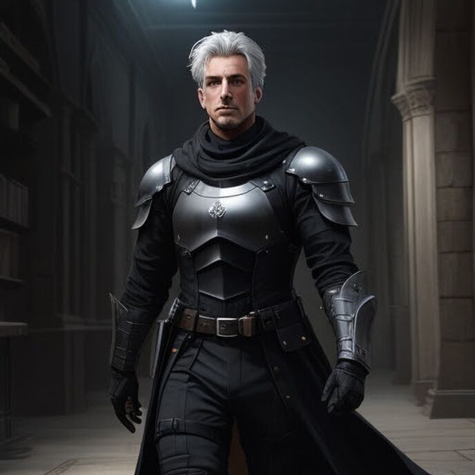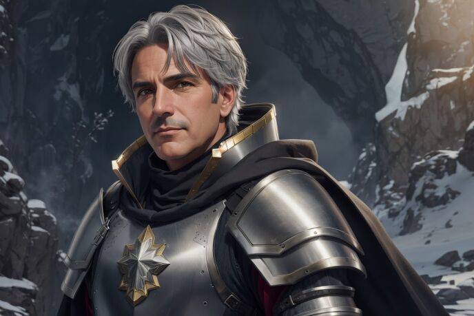 【華美な装飾のある黒い鎧とマントを纏う灰銀色の髪の毛の薄い口髭の壮年男性】