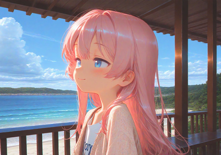 ドローンで運ばれた荷物を各々の部屋で確認したのち、別荘2階の突き出した屋根の下のバルコニーに集まって昼食。ビーチの向こうに広がる海からの潮風を受けて澪はご機嫌だった。他の部員も、テーブルに用意されたレストランのようなしつらえに歓声を上げる。…陽葵を除いて。