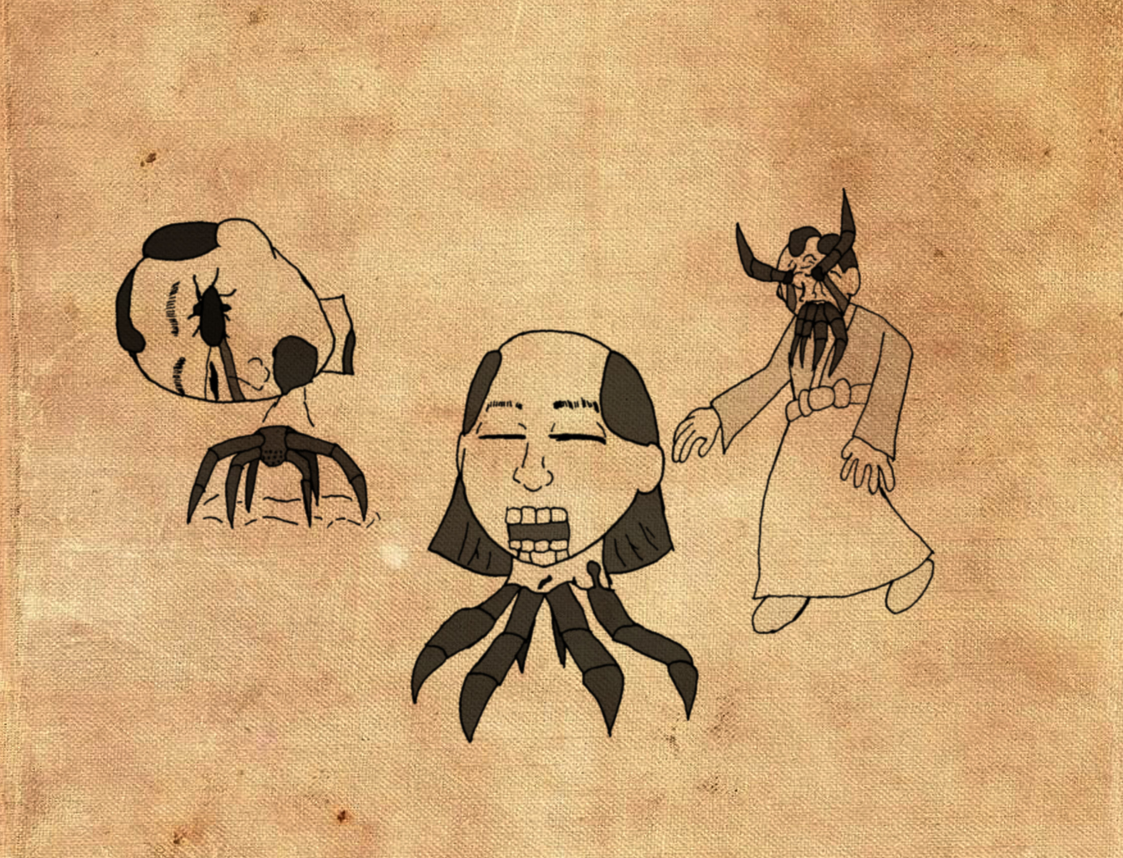 華南は引きはがそうとするとまわりから虫の足を生やした部下の生首と寄生された上司が来る。