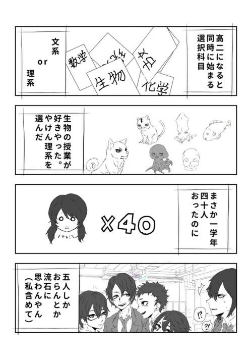 理科の授業が好きだったからって理由で理系を選んだ。でもね、文系と理系でそんな人数が変わるとは誰も思わないでしょ!?