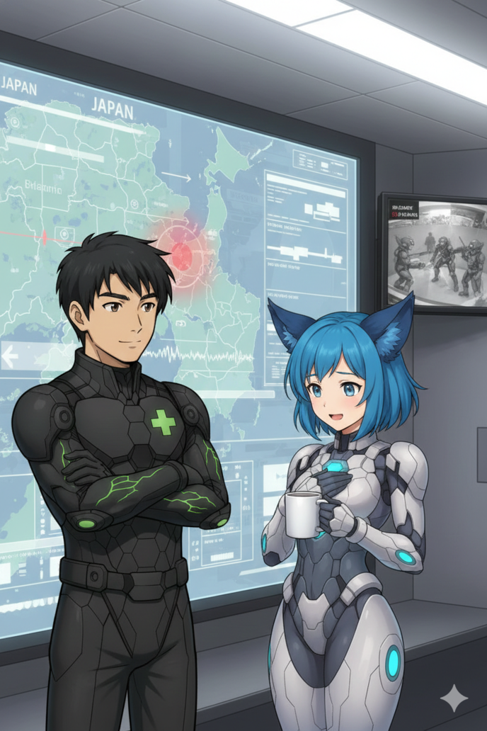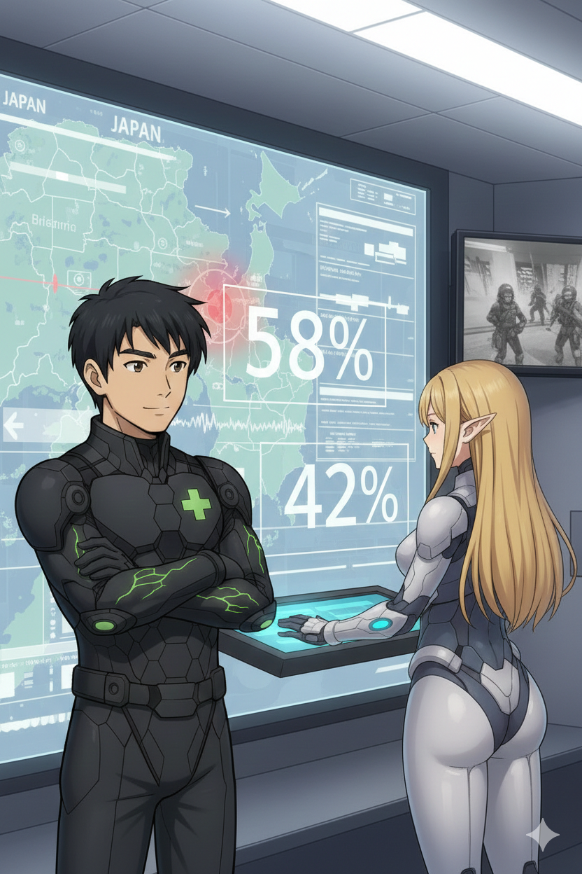 その笑みをかき消すように、司令ルームに真紅の警告灯が走り、低く重い警報音が鳴り響いた。 広島方面を示すホログラムが、まるで怒りに燃える心臓のように赤く脈動し、空気が一段と重くなる。