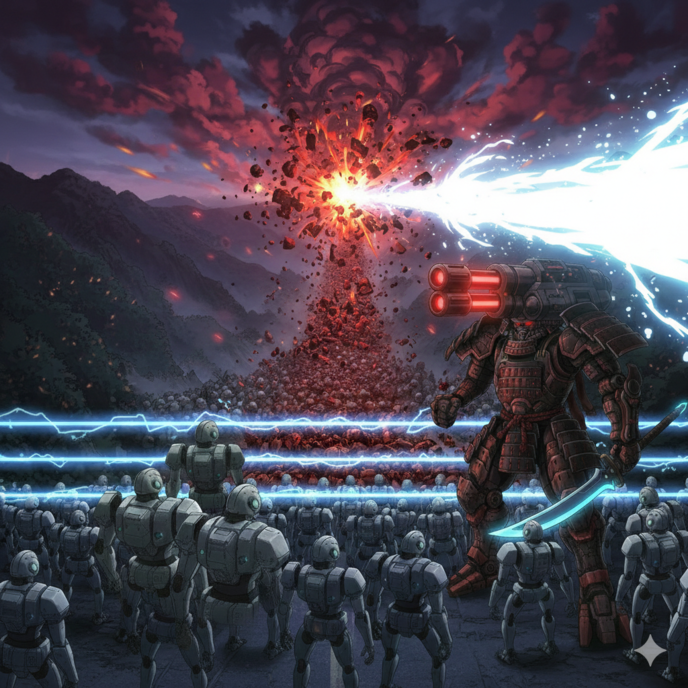 この兵器の「原型」こそが、九州制圧戦において戦線を支え、多大な犠牲を払いながらも最終的な勝利をもぎ取った立役者だった。 当時の武器ですら凄まじい破壊力だったが、それをさらに効率的な「処理機」へと凶悪に進化させたのが、目の前の『耕作者』だ。