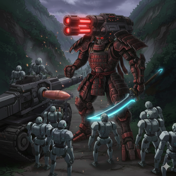 「この件に関しては抜かりはございませんわ。お姉様の配下ロボに、『高橋紹運(たかはし じょううん)』の人格OSをインストールし、『不退転の守護(デッドライン・シールド)』を最優先命令として上書きして参りましたわ。 かつて岩屋城の戦いで、5万の大軍をわずか数百人で迎え撃ち、壮絶な時間を稼ぎ出した防衛の天才です。九州の要塞群を任せるなら、彼女以上の適任はいません。たとえ装甲が砕け散ろうとも、彼女は折原様の背中を預かる『不落の盾』として立ち続けるでしょう。今、留守を任せている軽装ロボは数体ほど修復完了済みですが、あと数時間もすれば増産、修復対応で、30体そして、九州制圧戦で失われた180体の軽装ロボが戦場に復帰できるでしょう。」