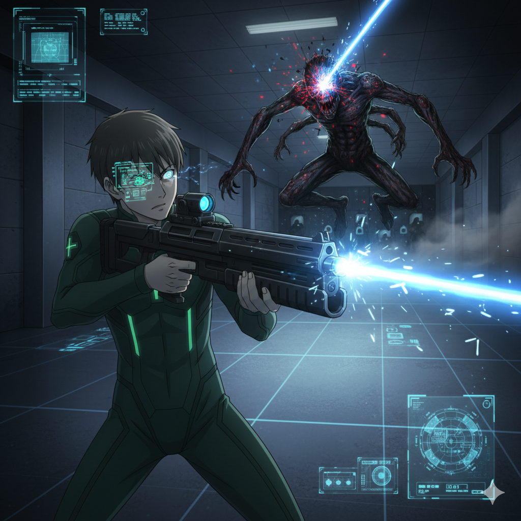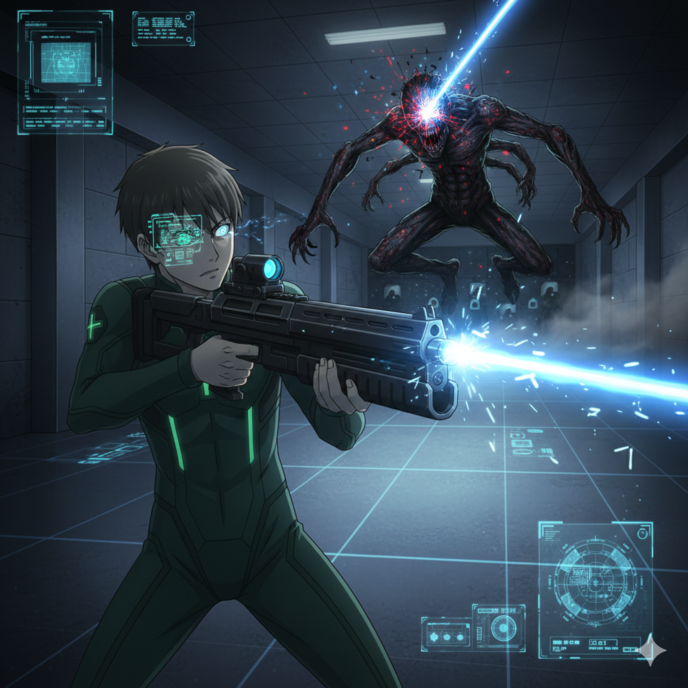 そう言いながら、ケイジはラックから電子制御式のタクティカル・レールガンを抜き取り、折原へ放り投げた。 折原はそれを無造作に受け取ると、銃身のインジケーターが青く点灯するのを確認し、慣れた手つきでシステムを同期させる。その動作には、かつて公務員であった面影はなく、生き残ることに執着する「兵士」の冷徹さが宿っていた。