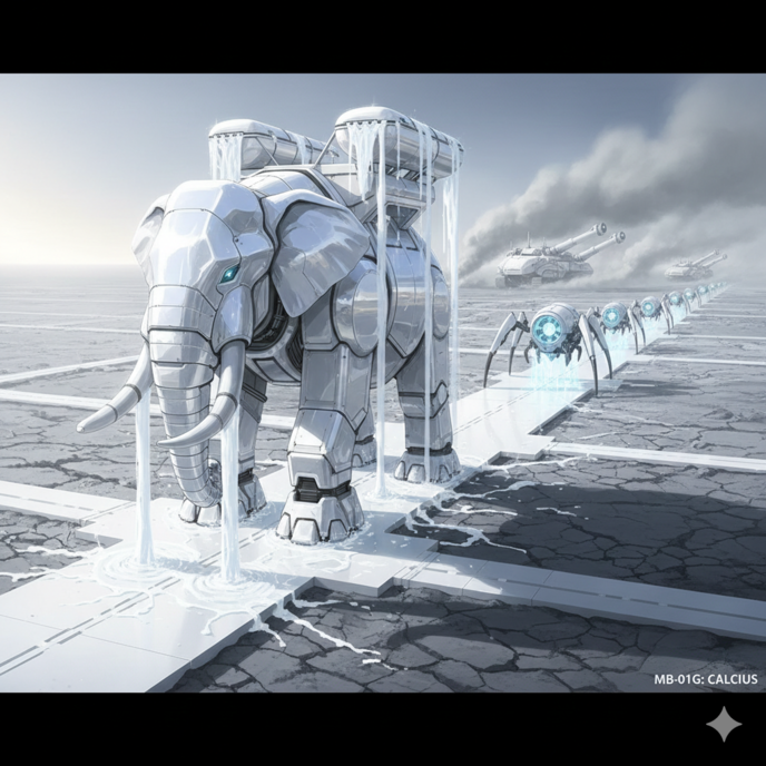 次に動いたのは、インフラ構築型ロボットの編隊——MB-01G『カルキウス』たちだ。 象のような巨躯を持つ彼らは、折原の「牛乳哲学」を体現するかのような純白の装甲を朝陽に輝かせ、整えられたばかりの灰の海へと踏み込んでいく。