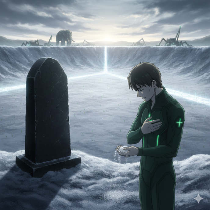 重機が唸り、ドローンが舞い、ナノマシンが光るその焦土は、もはや「死の場所」ではなく、人類が反撃に転じるための「巨大な工場」へと変貌を遂げていた。だが、その喧騒から少し離れたクレーターの縁で、折原はふと足を止めた。