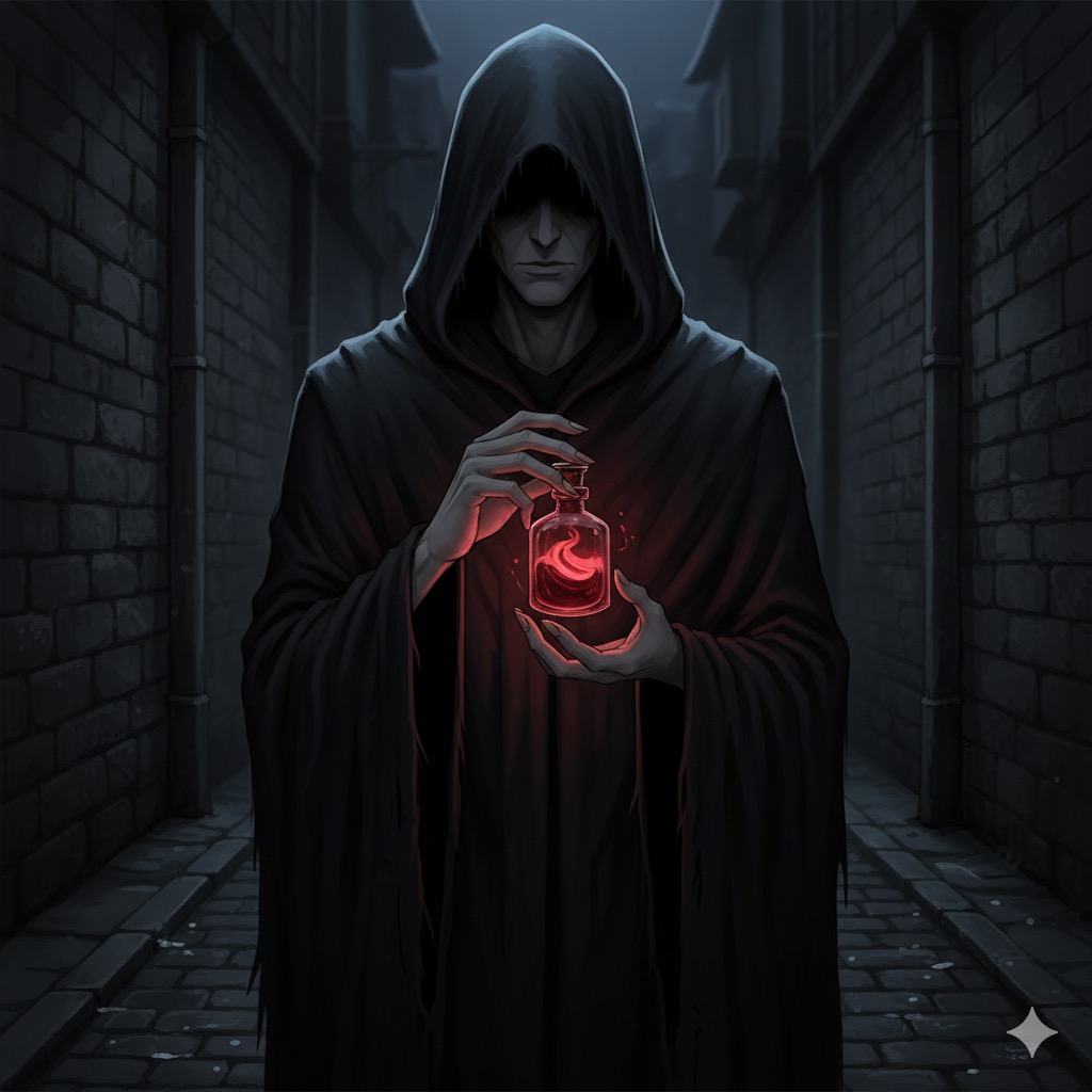 慌てて見上げると、そこには頭から足先まで夜の闇を切り取ったかのような深いマントを被った男が立っていた。顔の輪郭すら判然としない。ただ、フードの奥からこちらを射抜くような鋭い視線だけを感じた。
