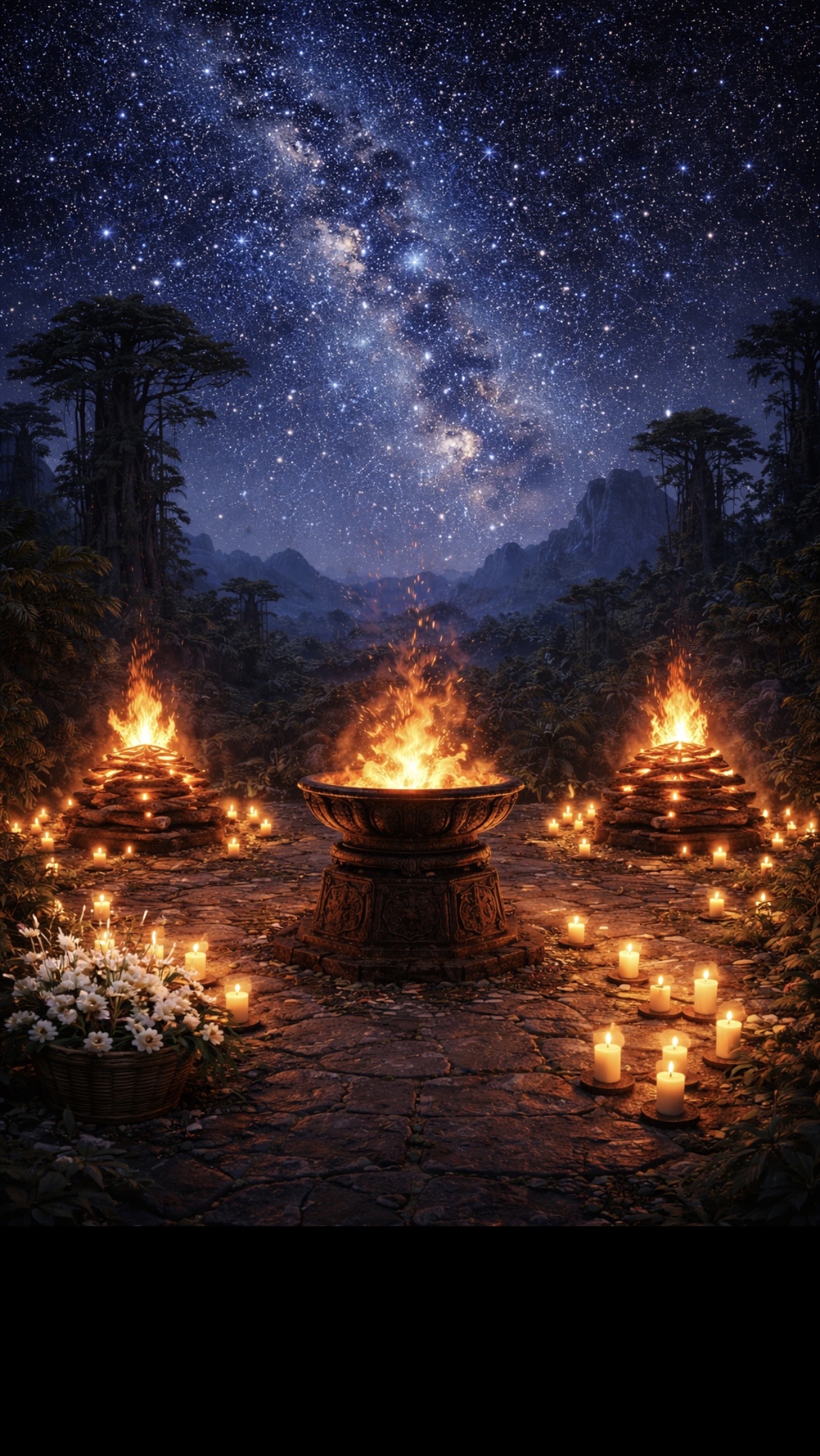 魂鎮めの火台の炎は、やがて星々の輝く銀河へと溶け込むように昇っていった。