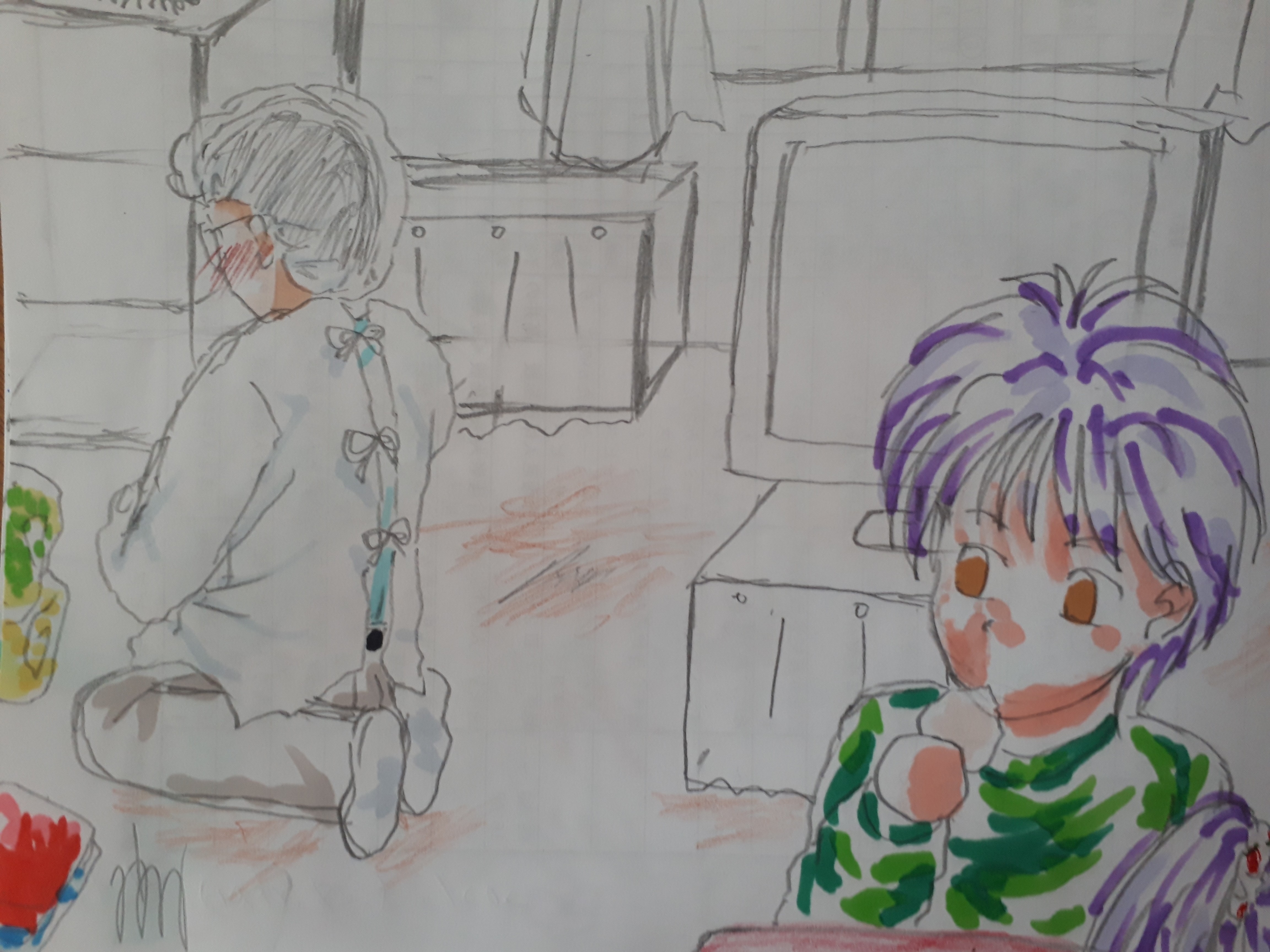 ひとりは髪をふたつに分けて高いところで縛ってる可愛い女の子で、もうひとりは女の子と同じ派手な色をした男の子です。