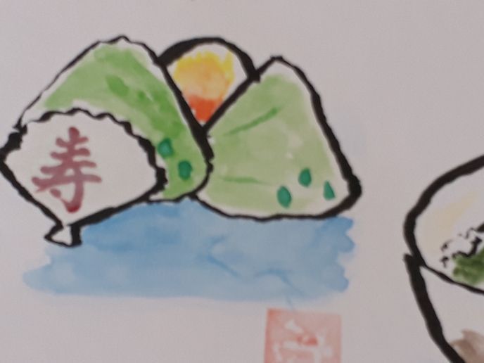 渋いお茶を紙コップに注ぎ、あまぁいおめでたい和菓子を取り急ぎ2つ用意。