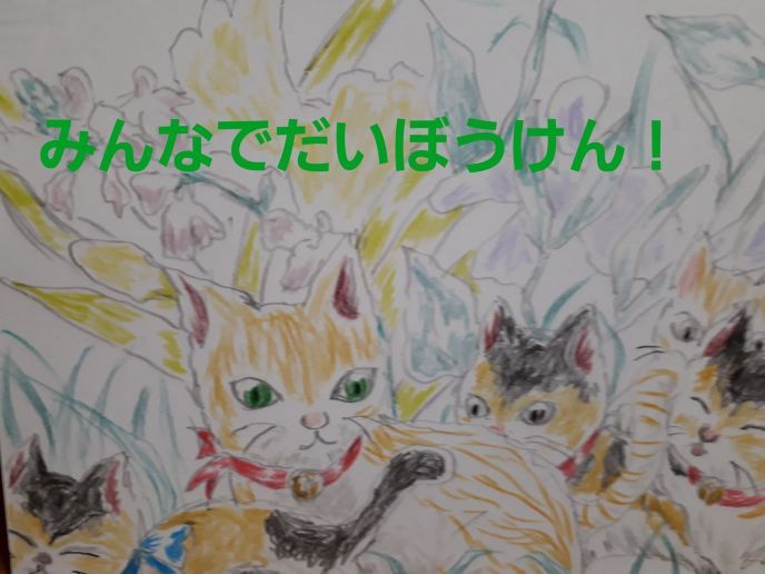 世界で一番怖い声が聞こえてきて、5匹は一斉にフリーズした。…………怖々とチャトラが背後を振り返ると……予定通りな展開が待っていた。