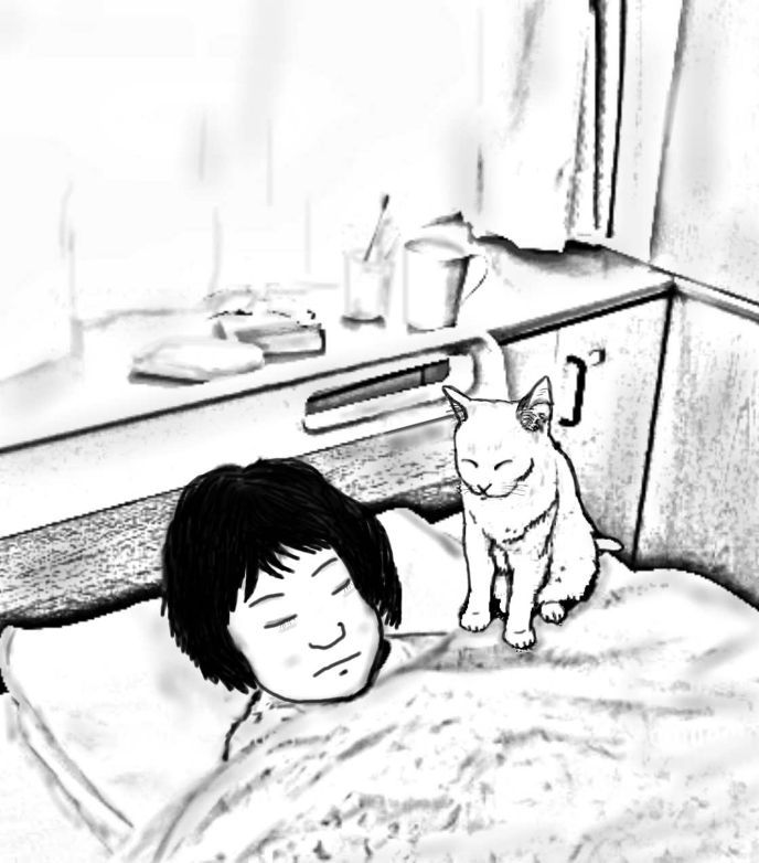 白ネコはベッドの下に来るとピョンとベッドに飛び乗った。そこには、目を閉じたさとみの姿があった。青い血の毛のない顔をしてねむり続けている。でも、少しずつだがさとみの顔に赤みが戻りつつあることを見逃さなかった。