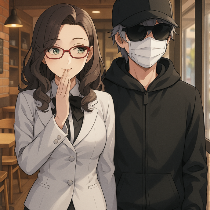 右側に立っている、全身黒ずくめの男?はサングラスを掛けてマスクをしっかりと装着し、すらりとした背丈を隠すように背中を丸めていた。対してその隣にいる人物は、黒いスーツをバシッと着こなし、亜麻色の巻毛を胸まで伸ばしたある意味で目立ちまくっている女性。