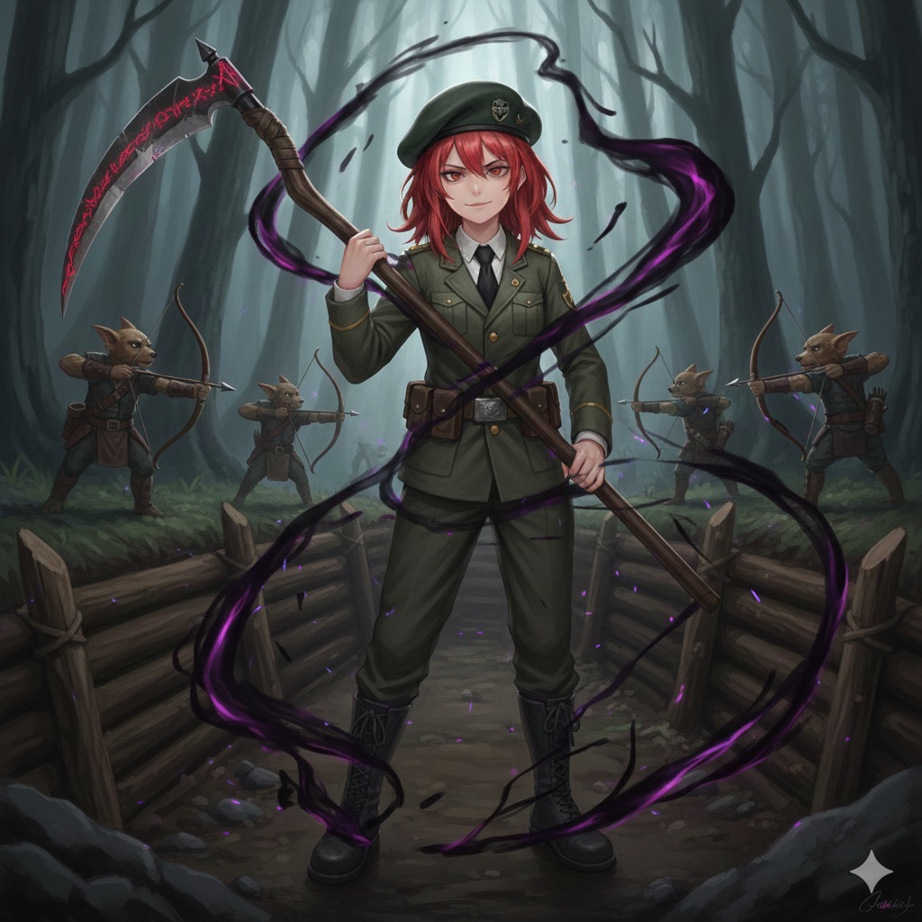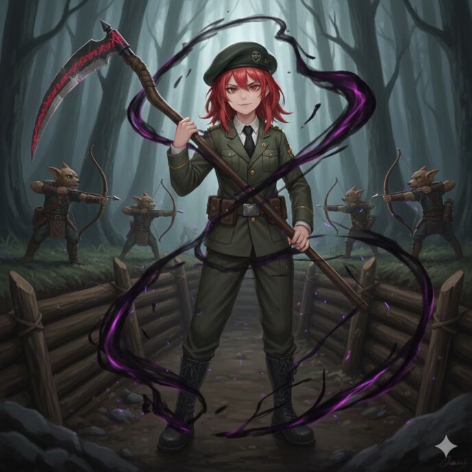 そこでは、緑色の軍服を鮮やかに着こなした四女のマキが、巨大なデスサイズを肩に担いで欠伸をしていました。