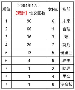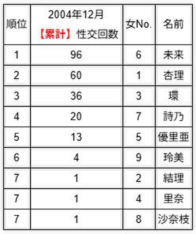 累計でも未来が独走。来月には記念すべき100回を突破するだろう。もう少し頑張ってほしいのは環だ。腐っても裏彼女のポジションなのだから、少なくとも杏理の回数はさっさと抜き去ってほしいところだ。