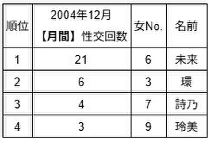 しおりを挟むいつも通りだが、今月も未来がぶっちぎりという結果に終わった。1ヶ月で20回以上抱いたのは8月以来だ。夏休みとか冬休みとか、長期休みがある月は今後も未来との回数が伸びるかも知れない。
