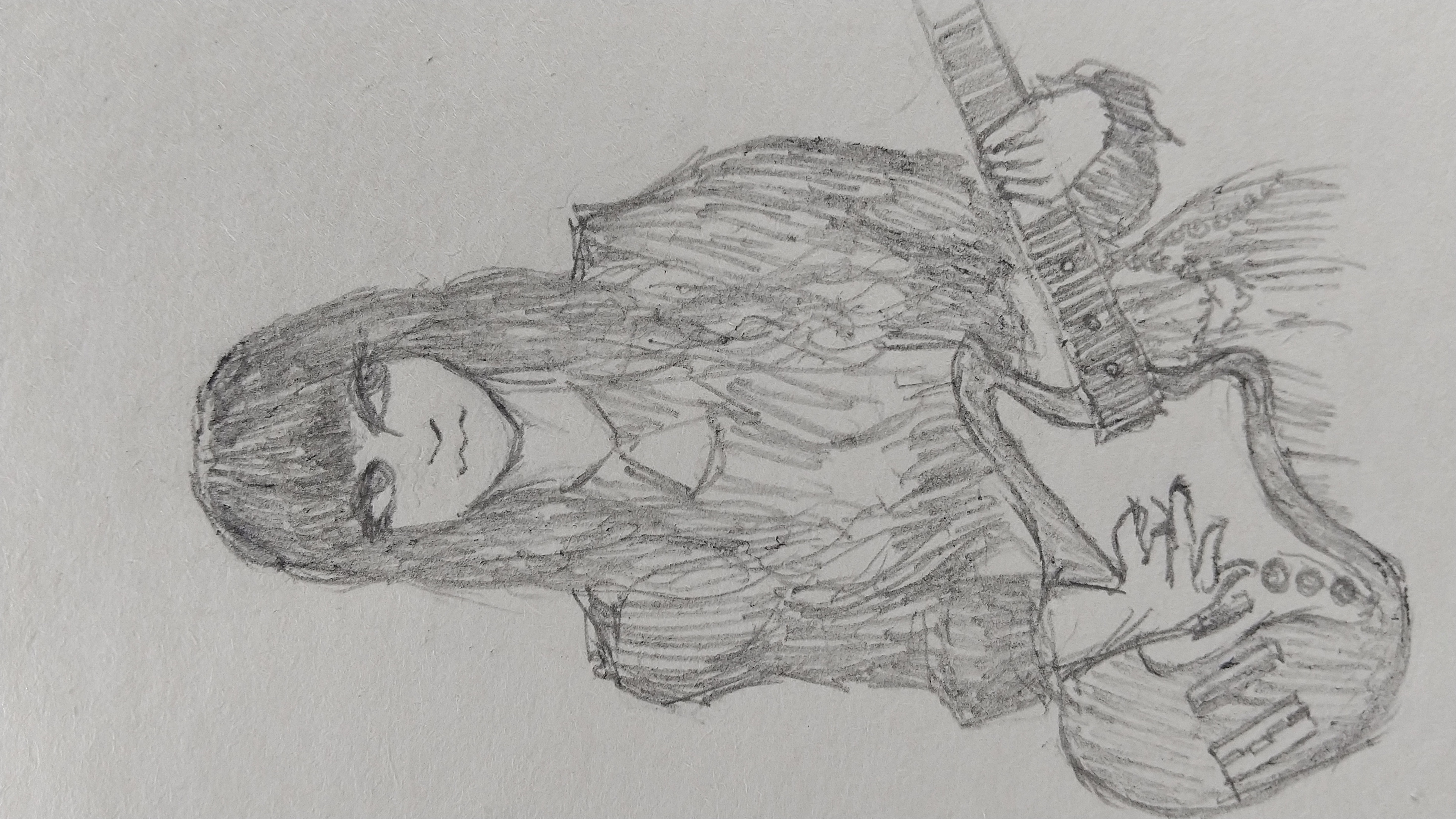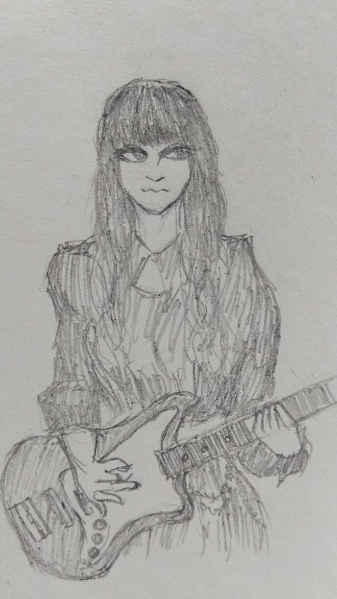 イメージ落書き。凄腕のベーシストであり漆黒の長髪に切れ長の瞳のクールビューティー。ウィスキーやテキーラをストレートで飲み(ステージでも)、喫煙者でもあるそうだが元ミッシェルのチバみたいにならないか心配…