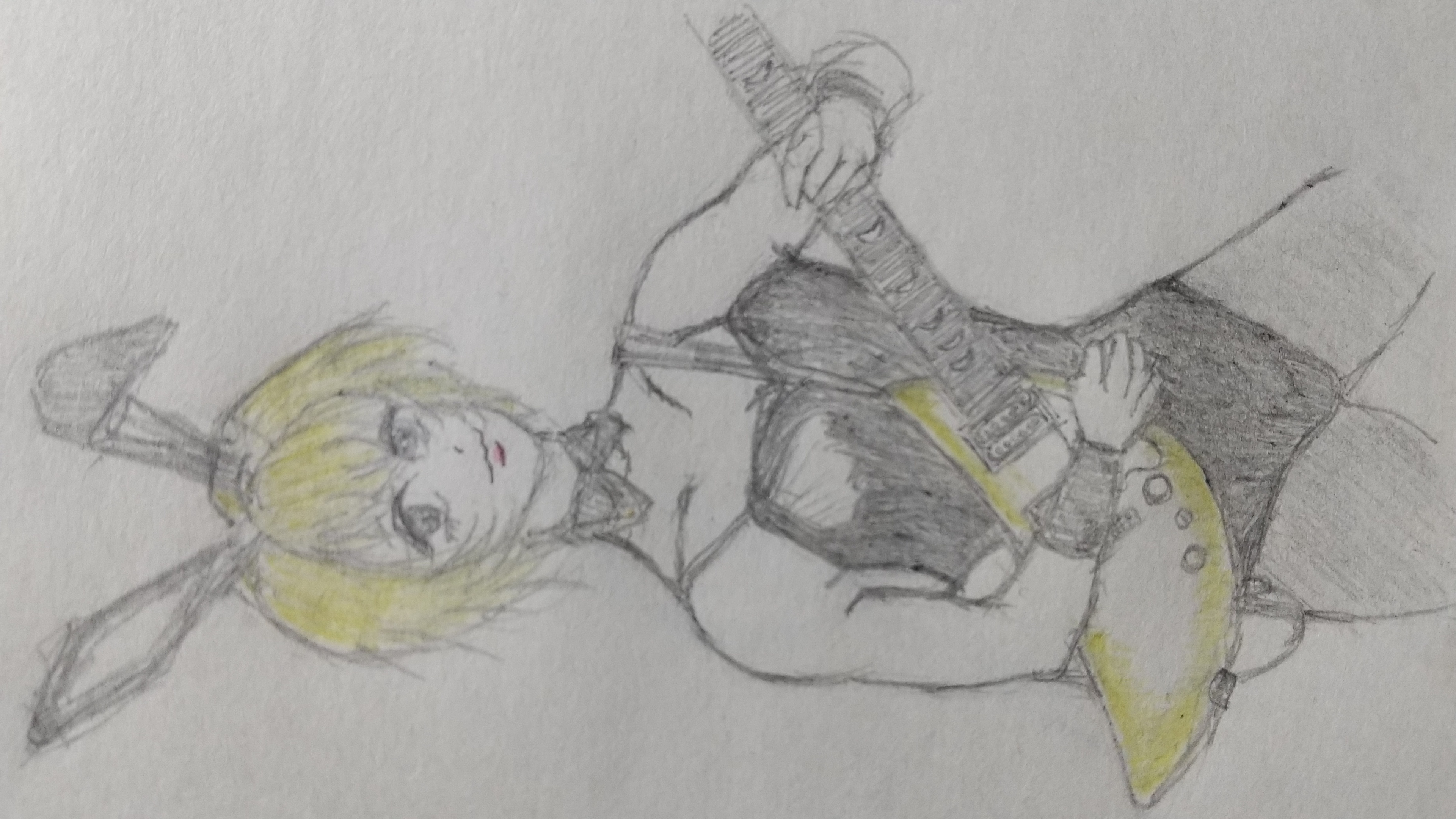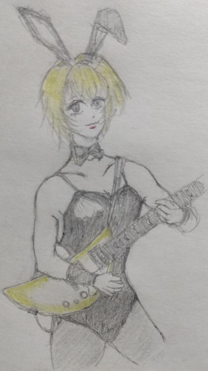 三日月型ギター→月→ウサギ→バニーガール。絵描くのうん十年ぶりに再開。元々1くらいだったスキルがマイナス100くらいに劣化してる…