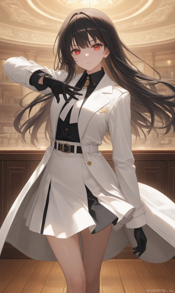 金糸の装飾をあしらった真っ白なコートと同色のスカートに身を包み、漆黒のインナーと手袋が強いコントラストを生んでいる。