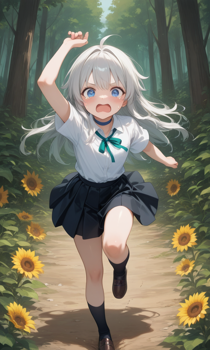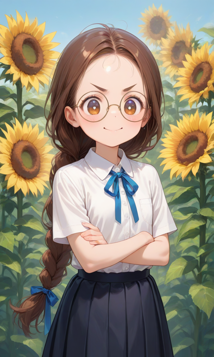 文学少女を思わせる風貌には不釣り合いな逞しさを振り撒きながら、群生するひまわりたちを背に、呆然とする二人に腕組みで対峙する。