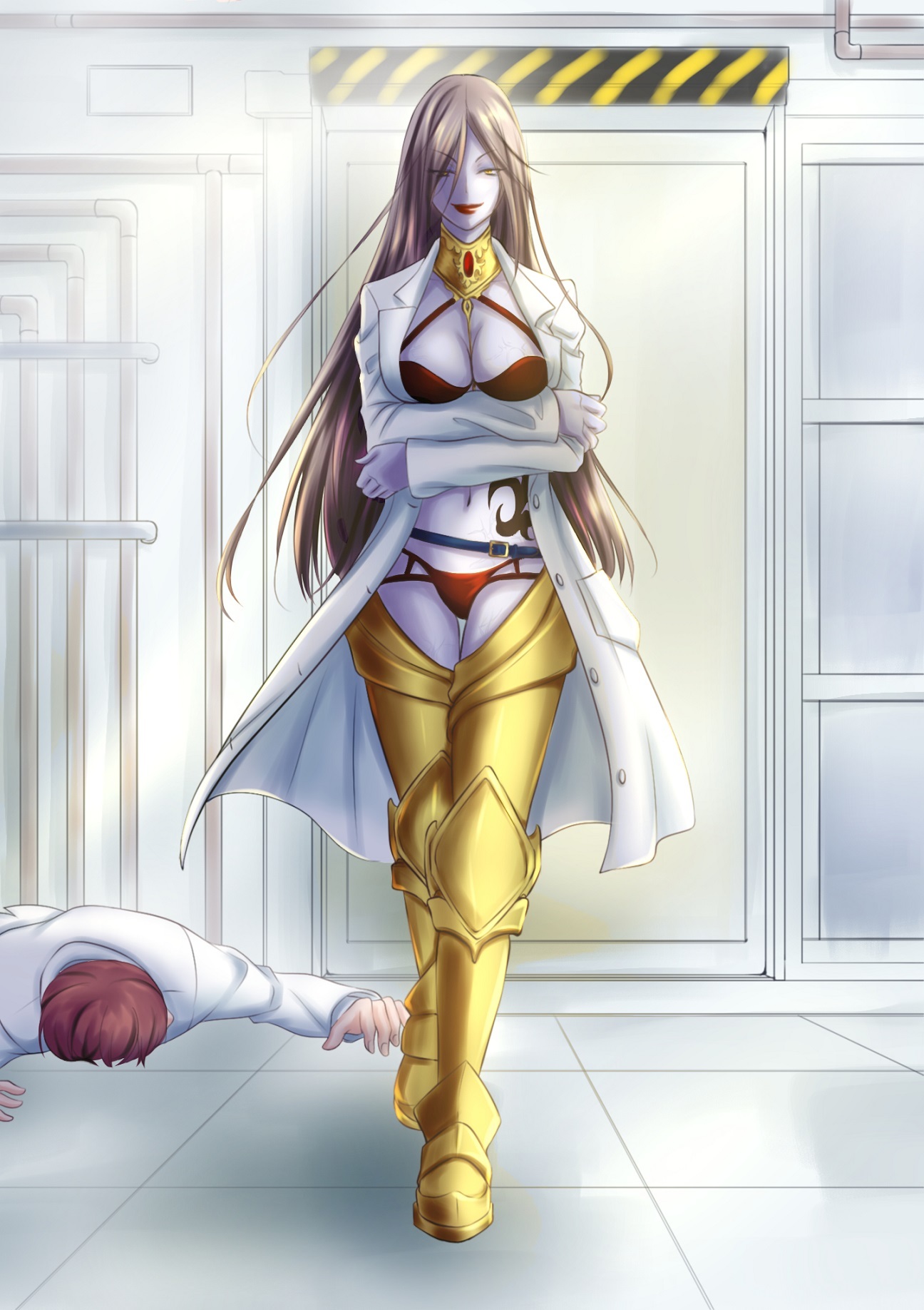 青白い……いや、それ以上に青い肌と白っぽい赤とも茶色とも取れないくすみきった腰まである長い髪、白衣の下はかろうじて大事な部分を隠しているだけの衣服と、その割に太ももまで覆うごつい足鎧……。目は爬虫類のように細められ、唇だけは真っ赤に彩られていた。