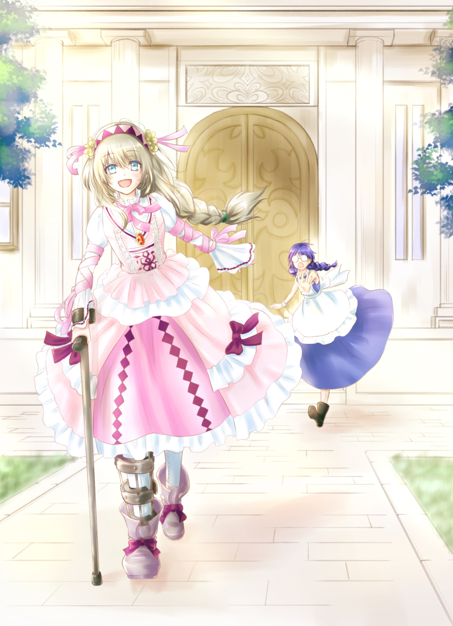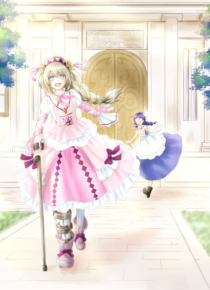 ナナセが門を開けてすぐ、遠くの方の玄関らしき扉から一人の少女がカツカツと杖を突きつつ急ぎ足で飛び出してきた。揺れる白金色の髪、ふわふわしたピンクと白のドレス、ひらひらのリボンが良く似合っていてとても可愛らしい。ただ足が悪いせいだろう、歩く速度はかなり遅くふらふらと危なっかしくて仕方がない。