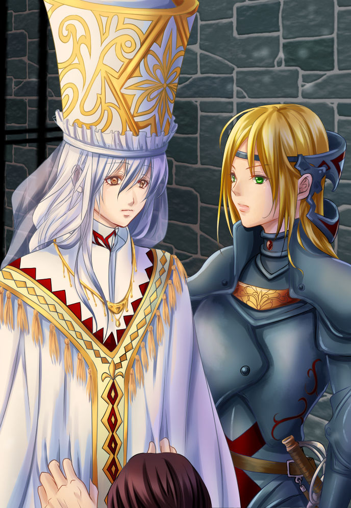 ゆったりした服装で体形は良く分からなかったが、太ももの辺りまである白くて長い髪を編みこんで後ろでひとつにまとめている感じや顔の作りから、恐らく女性だろうと判断した。その横には腰まである真っすぐな金の髪をなびかせた騎士っぽい女性が並んでる。どうやら審査官とその護衛って所だろう。全く、粛々ってのはこんな感じを言うんだろうな。