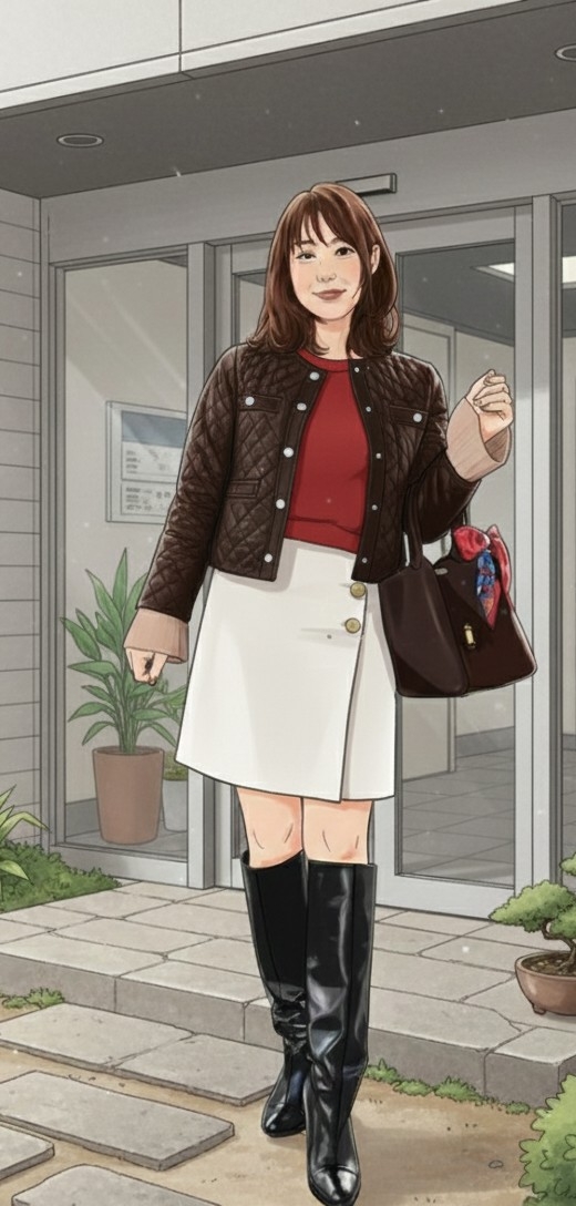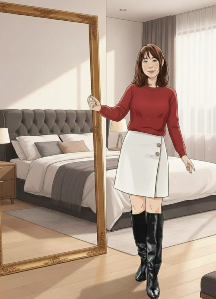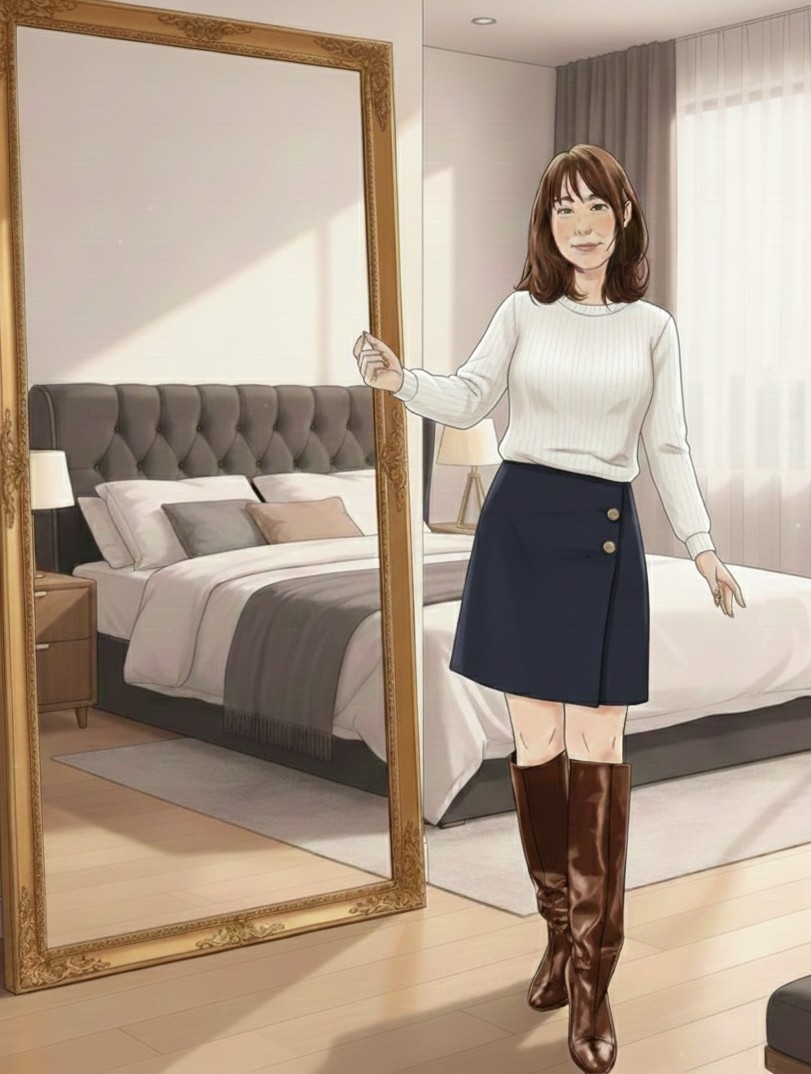好美はクローゼットの前で考えた。若すぎないように、でも頑張りすぎていないように。結局、シンプルなニットとほどよい丈のスカートにロングブーツを選び、化粧はナチュラルメイクに仕上げた。