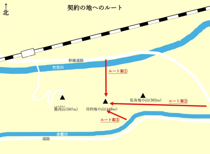 第一のルートは竹花川沿いの幹線道路を鷲河山の東まで車で走り、そこから船で川を渡る。その後徒歩で南下しながら山を登り、目的地を目指すというものだ。