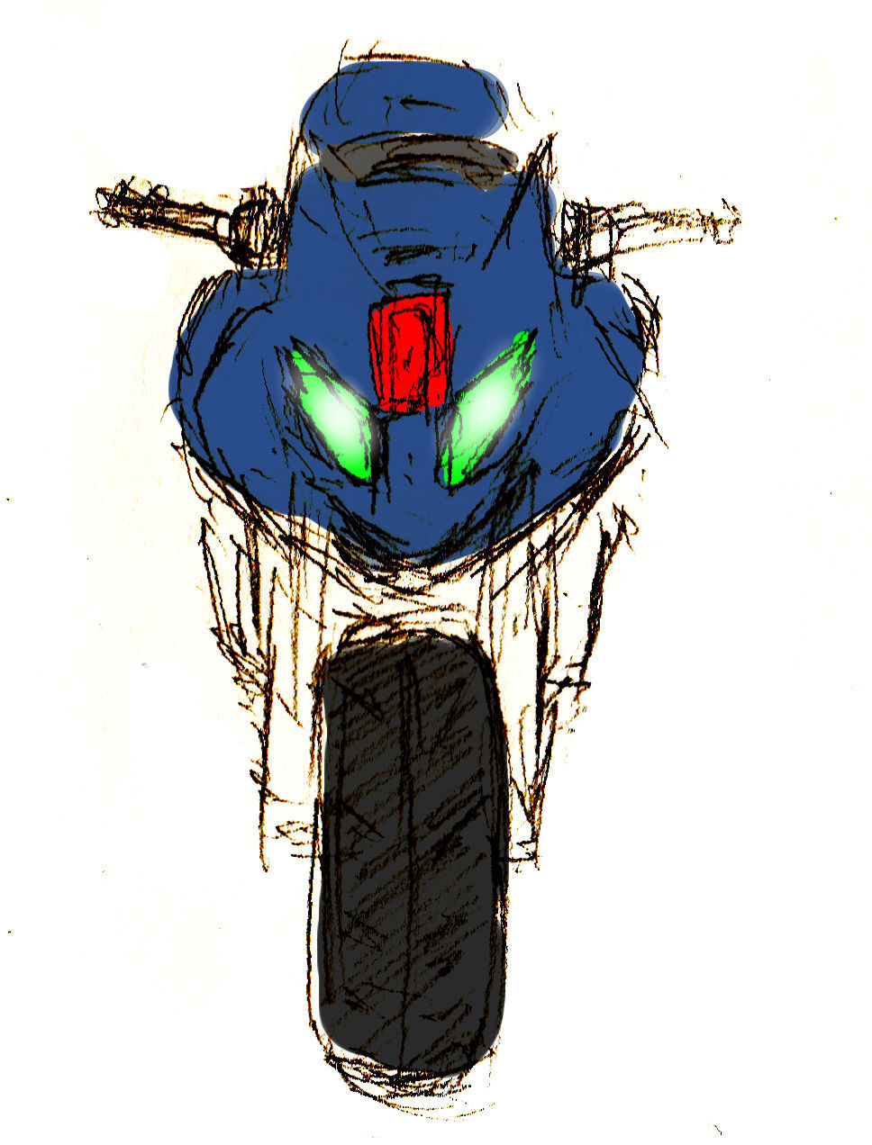 その二つの車輪を前後に備えた青い何かは「ブイィーン」とエンジン音に似た音を発すると、その車輪の上に付いた二つの目らしき物を緑色に輝かせた。