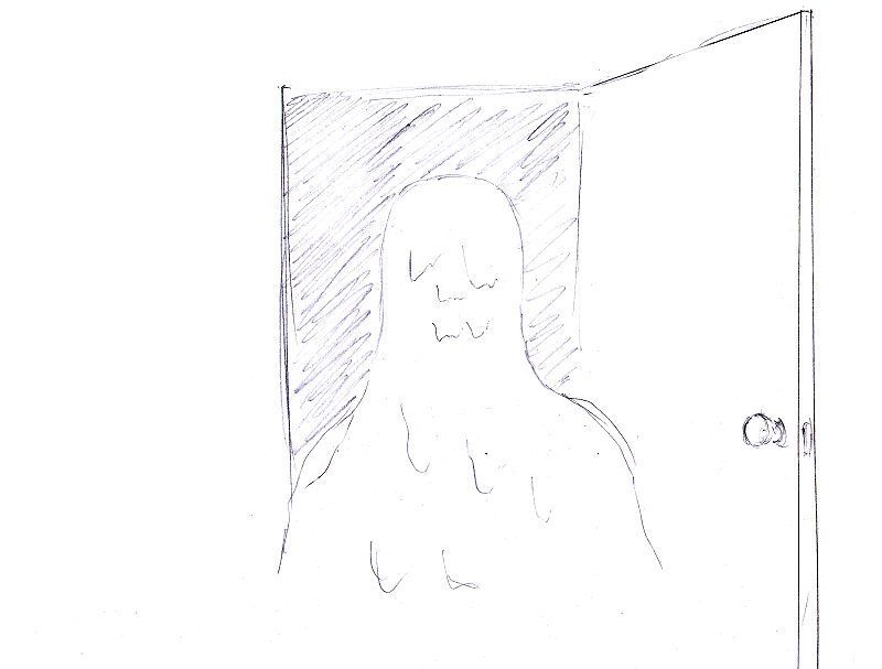 パムはロビーの右のドアに歩み寄り、ドアに耳を寄せる。