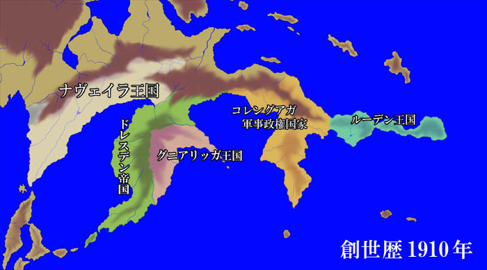 「ドレスデン帝国、コレングアガ軍事政権国家、ルーデン王国、グニアリッガ王国という四つの国家に分裂、覇権を争っていました」