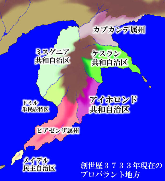 現在プロバラントという名称は属領の呼称ではなく地方名として定着していますが、このプロバラント地方は七つの区域に区切られていて、共和自治区が3、民主自治区が1、単民族特区が1、属州が2という構成になっていました。