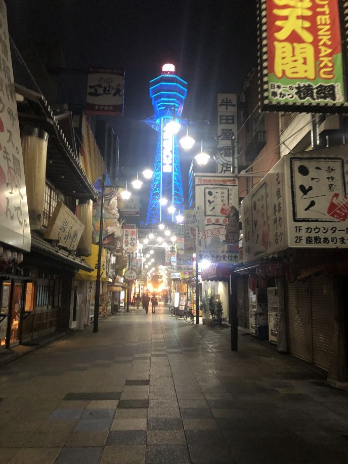 この写真を撮った時間は深夜でなく、20時過ぎである。有名な串カツ屋さんはもちろん、ほとんどの飲み屋さんや食べ物やさんが閉店して、人もいなかった。