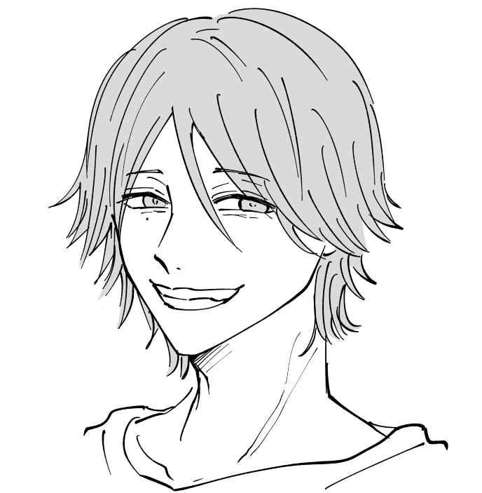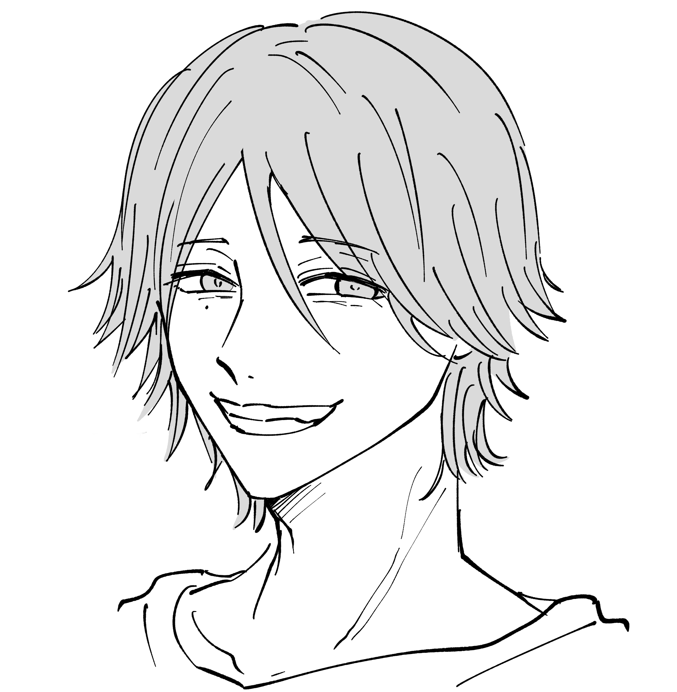 真面目だが強気で、どこか挑発的な笑みを浮かべる青年。