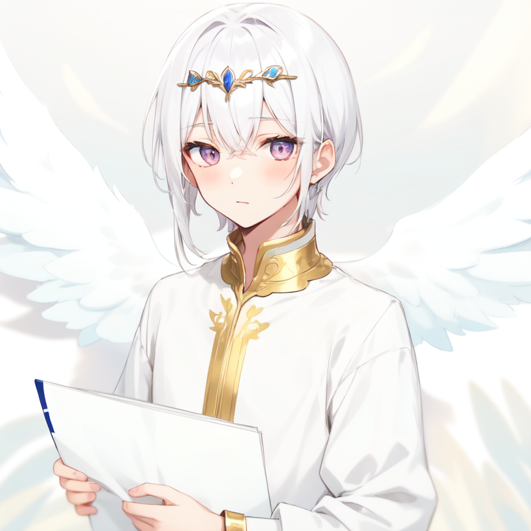 彼が指にはめていたホワイトオパールの指輪が一瞬にして輝きを放ち、周囲を包む光に満たされました。その光の中から、天使のような羽根が生え、エルキースの頭にはホワイトオパールがきらめくサークレットが輝き、手には金で刺繍された豪華な白い本が現れ、まるで知識の神であるかのような風格をまとっていました。